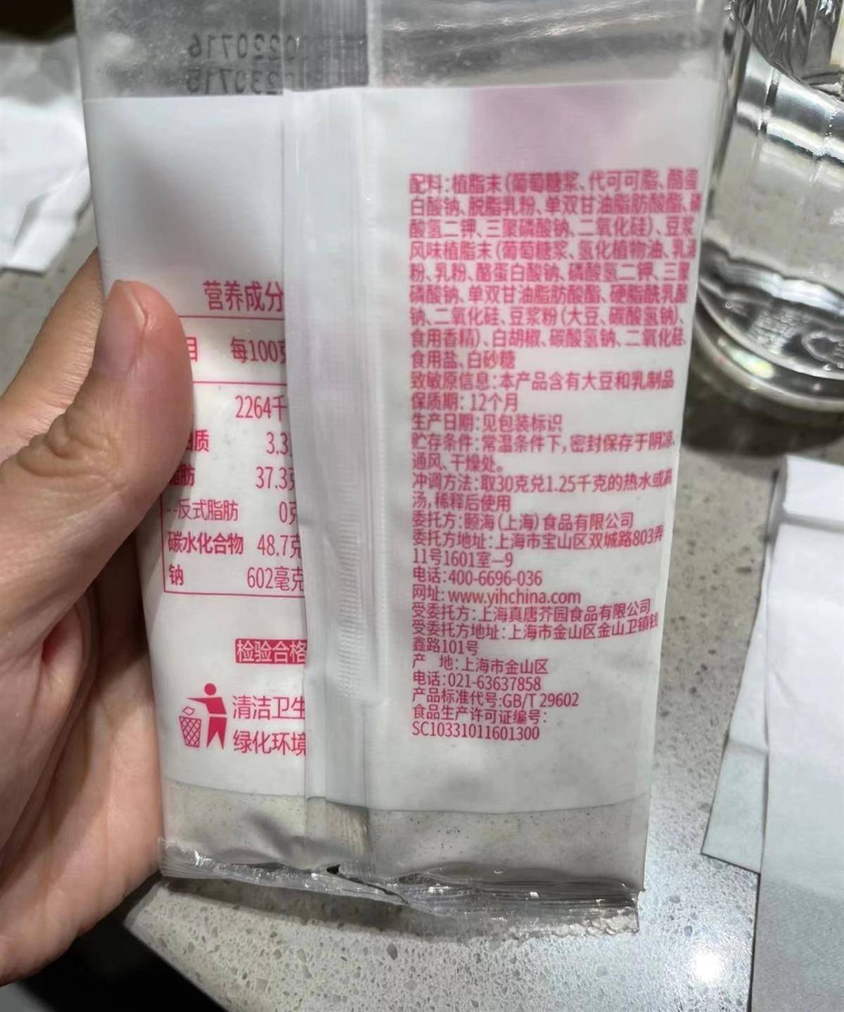 店员拿来的粉料包上写着“猪肚鸡粉料(风味固体饮料)”,配料表中的前两大成分为植脂末和豆浆风味植脂末。该网友称,自己每次去吃海底捞都要点猪肚鸡锅底,配上葱花香菜等喝汤,担心粉料包中的“植脂末”、“氢化植物油”等不健康,以后不会再点。