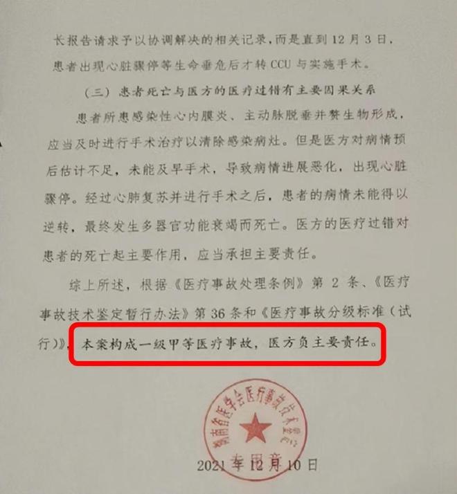陈女士表示,入住该院心血管内科后由于延误手术时机,12月3日儿子意识丧失,当日做了主动脉瓣置换和赘生物清除手术,“我儿子在医院重症监护室22天,人没救到,他走时只有34岁。”