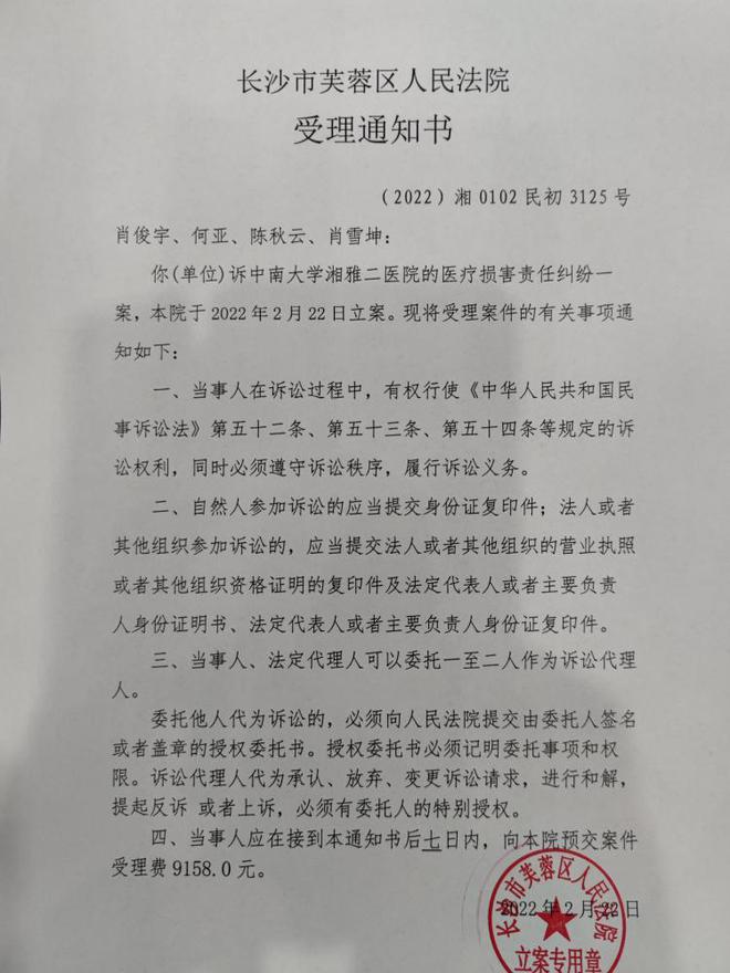2022年年初,家属将湘雅二医院起诉到长沙市芙蓉区法院,2月法院正式立案,目前还没有判决。