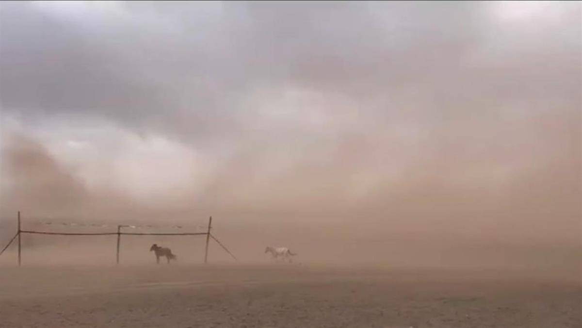 等不来雨,干旱却使沙尘暴成了这里的常客。在毕力格的印象里,今年起码也刮了三四次沙尘暴了。大风刮过干燥的沙地,卷起漫天黄沙,一米之外就看不见人畜,一不小心就能尝到干涩沙子的味道。在6月19日的社交平台上,毕力格发出所拍摄的漫天黄烟沙尘暴肆虐的场景。