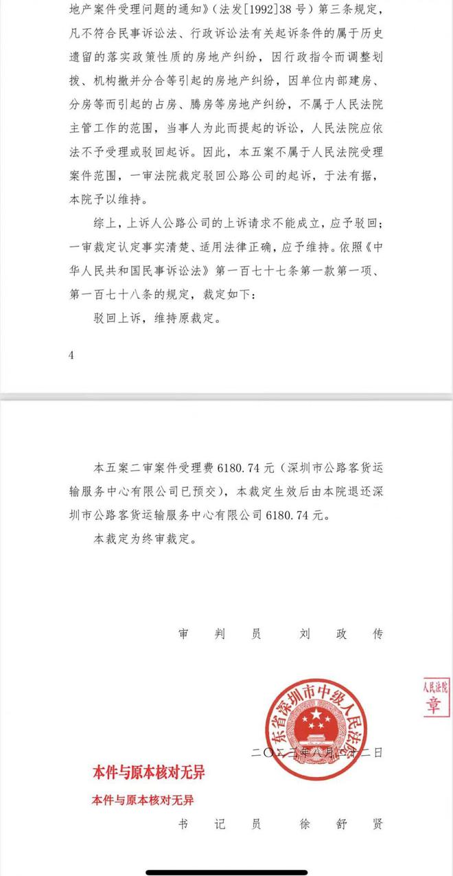 2022年12月22日,深圳市福田区人民法院认为因属于该公司内部房改房历史遗留问题,不属于人民法院受理案件范围,一审裁定驳回公路公司的起诉。公路公司不服,继续提出上诉。2023年8月22日,深圳市中级人民法院对公路公司起诉退休职工侵占租赁房屋一案做出二审裁定,驳回上诉,维持一审裁定。