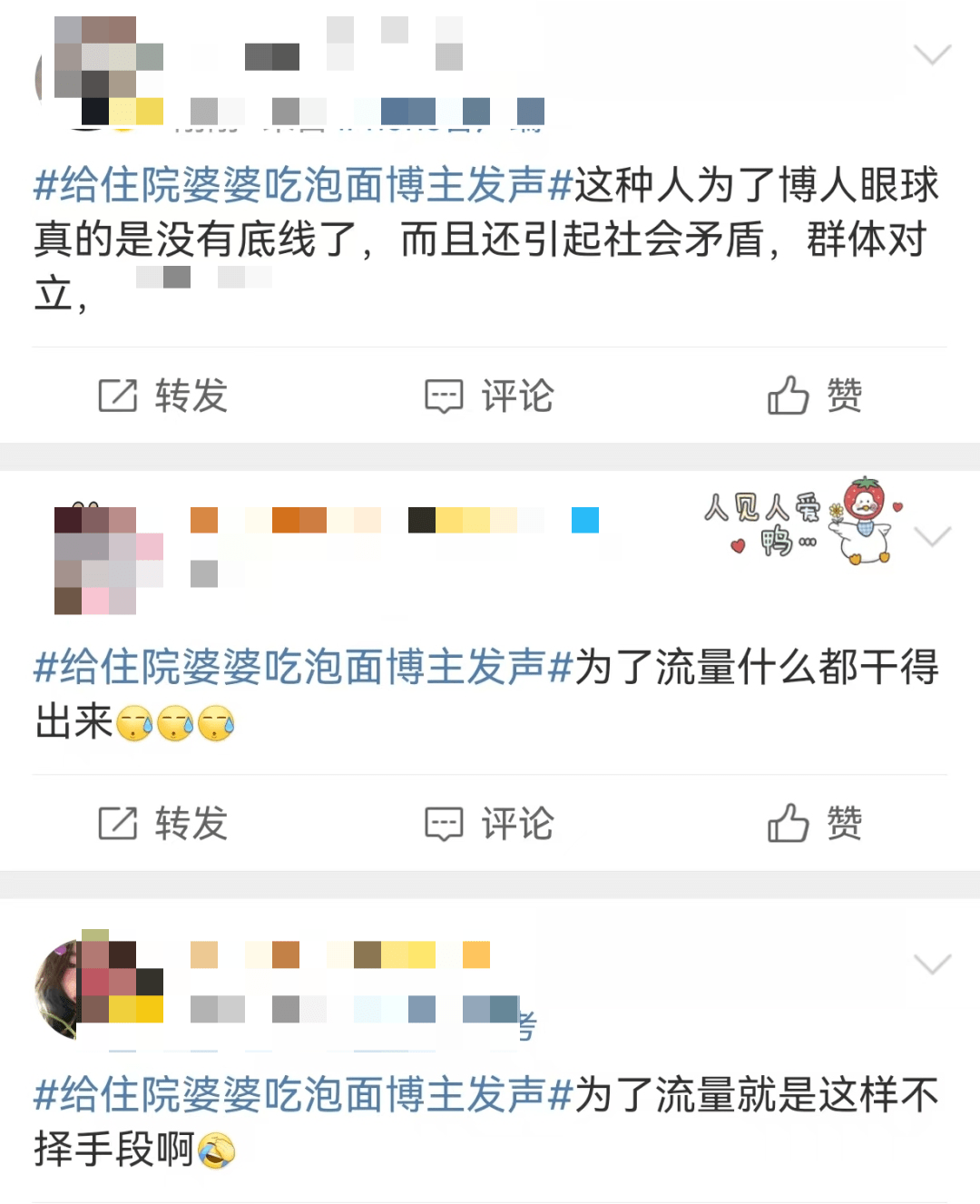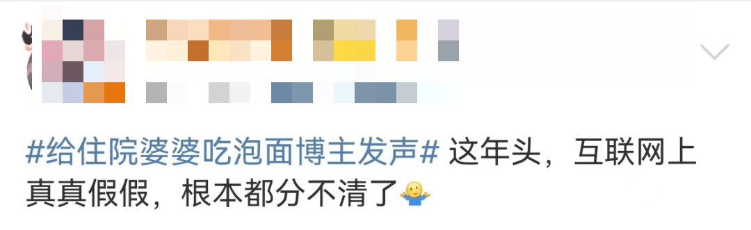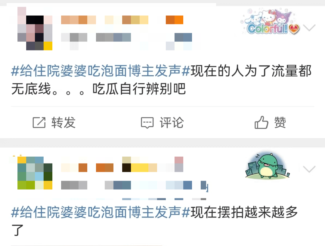 12月15日,发布“给住院婆婆吃泡面”系列视频引发热议博主,主动承认画面系摆拍。住院老人其实不是婆婆而是自己亲妈,发布摆拍视频是为了涨粉。