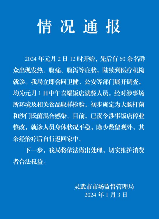 2024年元月2日12时开始,先后有60余名群众出现发热、腹痛、腹泻等症状,陆续到医疗机构就诊。我局立即会同卫健、公安等部门展开调查,均为元月1日中午喜耀饭店就餐人员。经对涉事场所环境及相关食品取样检验,初步确定为大肠杆菌和沙门氏菌混合感染。目前,已责令涉事饭店停业整改,就诊人员身体状况平稳,除少数留观外,其余经治疗后自行返回家中。下一步,我局将依法做出处理,切实维护消费者合法权益。