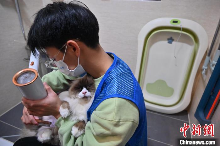 图为宠物洗护师为猫咪吹毛。俞靖 摄