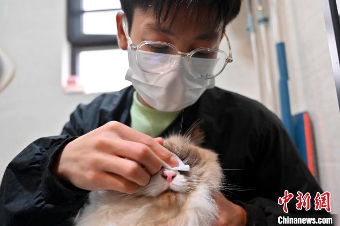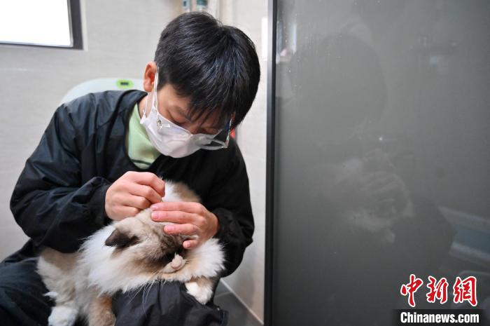 宠物洗护师为猫咪清洁眼部。俞靖 摄