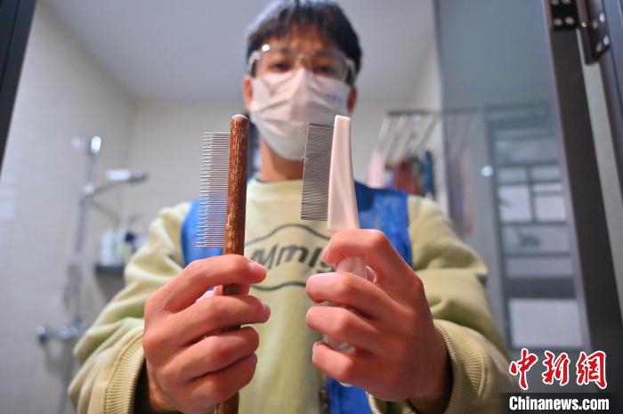1月6日,广西南宁,宠物洗护师班富稳正在为猫咪洗护。班富稳是一名“00后”,在南宁经营着一家宠物洗护店,提供“上门洗宠”服务。其受家中宠物猫启发,发现“社会化”不足的宠物普遍胆小敏感,不少养宠人有为“毛孩子”居家洗护的需求。嗅到商机后,他选择“踏足”宠物洗护行业。日常中,班富稳亲力亲为,常扛着大型“宠物烘干箱”爬楼,为萌宠服务时,细心地帮宠物梳理毛发,清洁洗护。