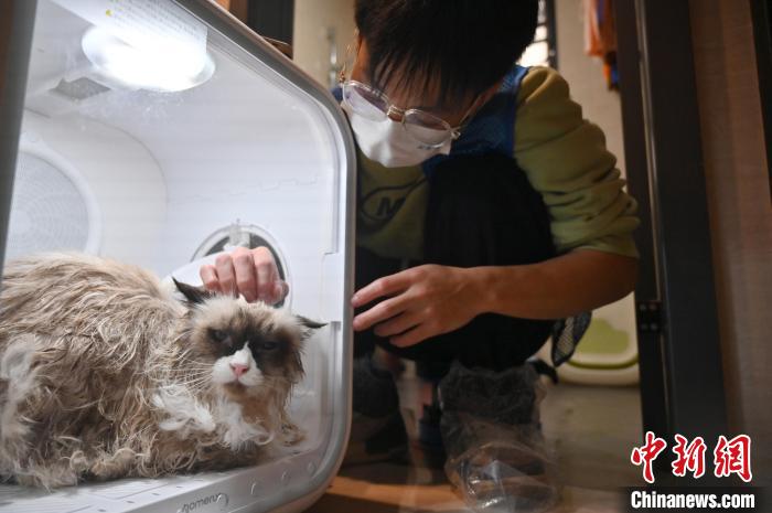 图为洗护结束后,班富稳透过自带烘干箱安抚猫咪情绪。俞靖 摄