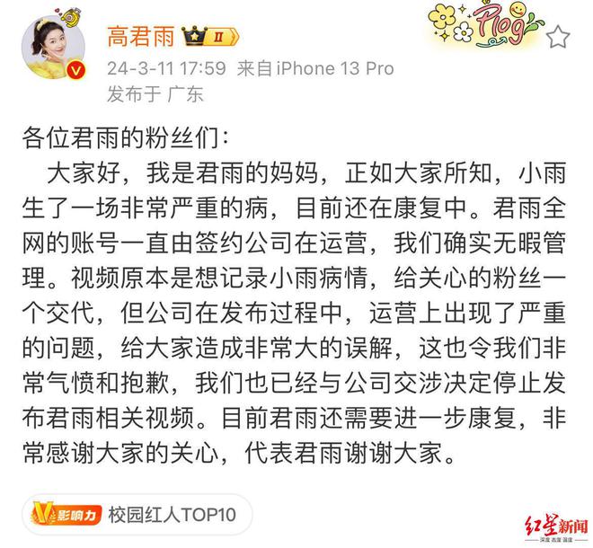 “大家好,我是君雨的妈妈,正如大家所知,小雨生了一场非常严重的病,目前还在康复中。君雨全网的账号一直由签约公司在运营,我们确实无暇管理。视频原本是想记录小雨病情,给关心的粉丝一个交代,但公司在发布过程中,运营上出现了严重的问题,给大家造成非常大的误解,这也令我们非常气愤和抱歉,我们也已经与公司交涉决定停止发布君雨相关视频。目前君雨还需要进一步康复,非常感谢大家的关心,代表君雨谢谢大家。”