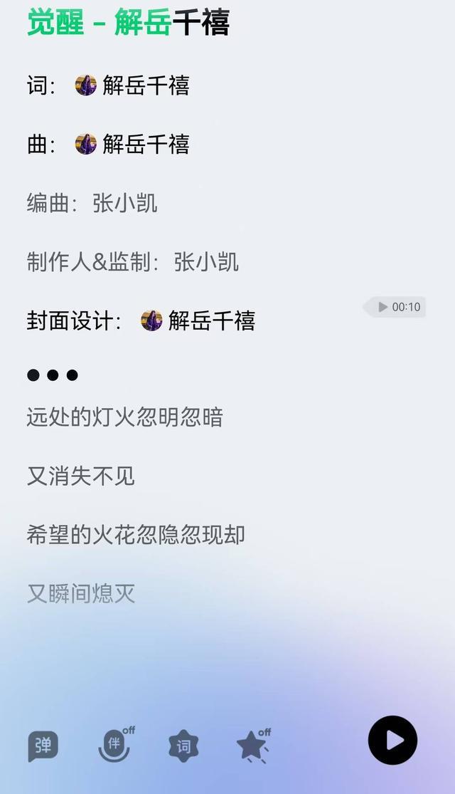 视频评论区,岳女士贴出了千千作词作曲的歌曲《觉醒》,歌词中写道,“失望的碎片散落在灿烂星海,悲伤的噩梦会在阳光最温柔的时刻醒来”。千千在13岁时,就曾写过一首名为《半悲调》的歌曲,词中写着“悲欢离合我只能默默体会,阴晴圆缺我只能默默观赏”,岳女士用这首歌表达着她的心声。
