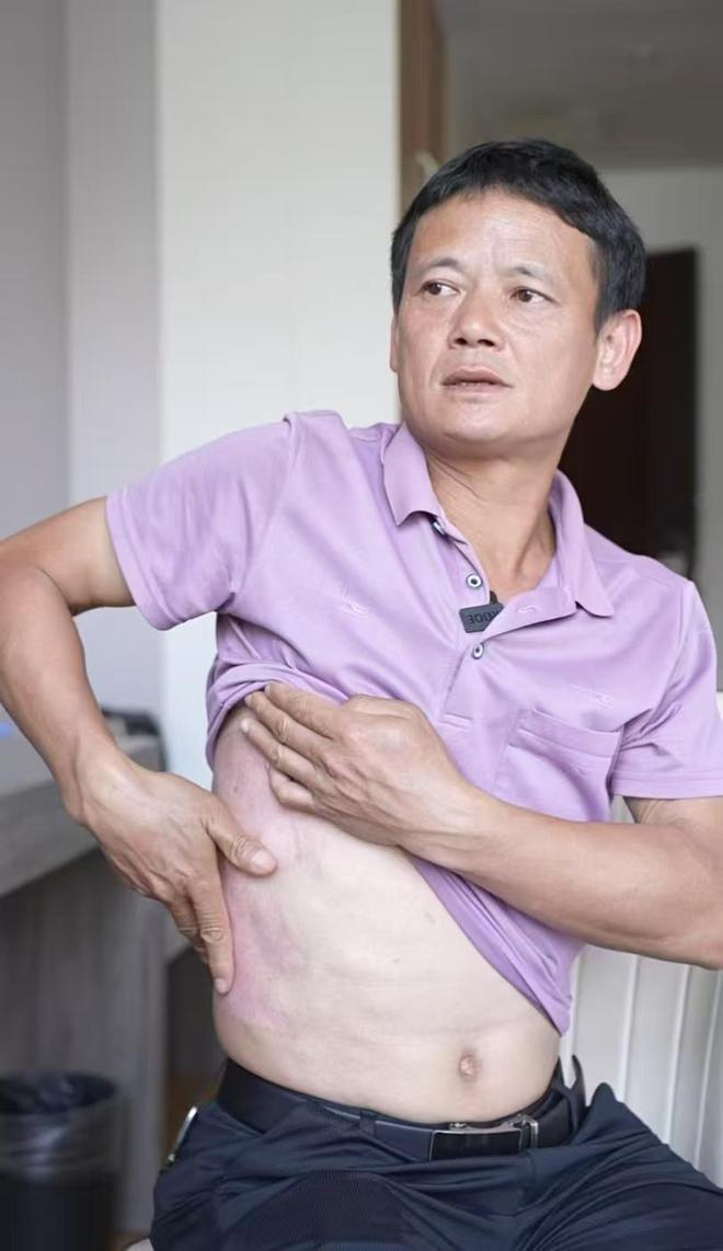 △杜保兵展示为儿子供皮后的伤疤。图/周翼 摄