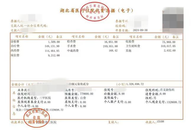 “钱没少花,光ICU就住了35天,很多地方都用得到钱。比如仅在医院洗澡,因为烧伤情况特殊,洗一次也得几千元。他四肢不能动,个子也不低,两个人抬他比较吃力,洗澡得请三个人,把他抱到专门的药剂池子里。”