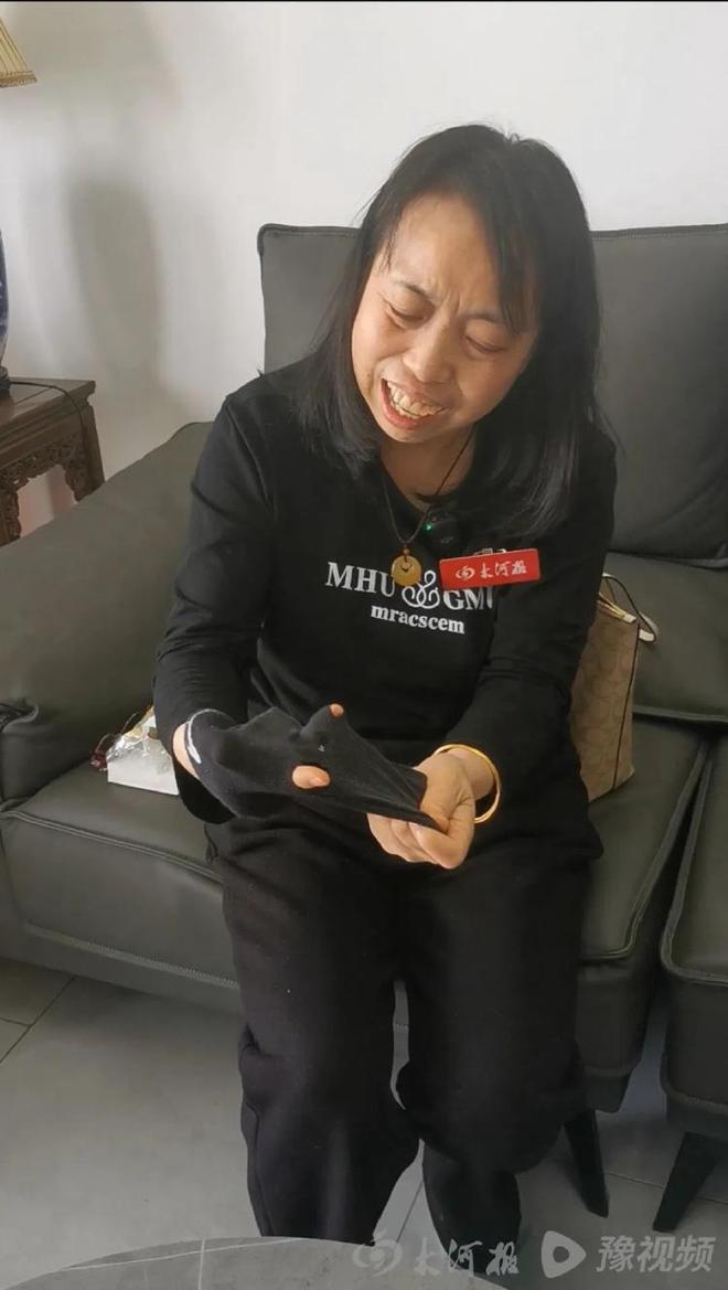 胡女士拿着已逝儿子的破洞袜子