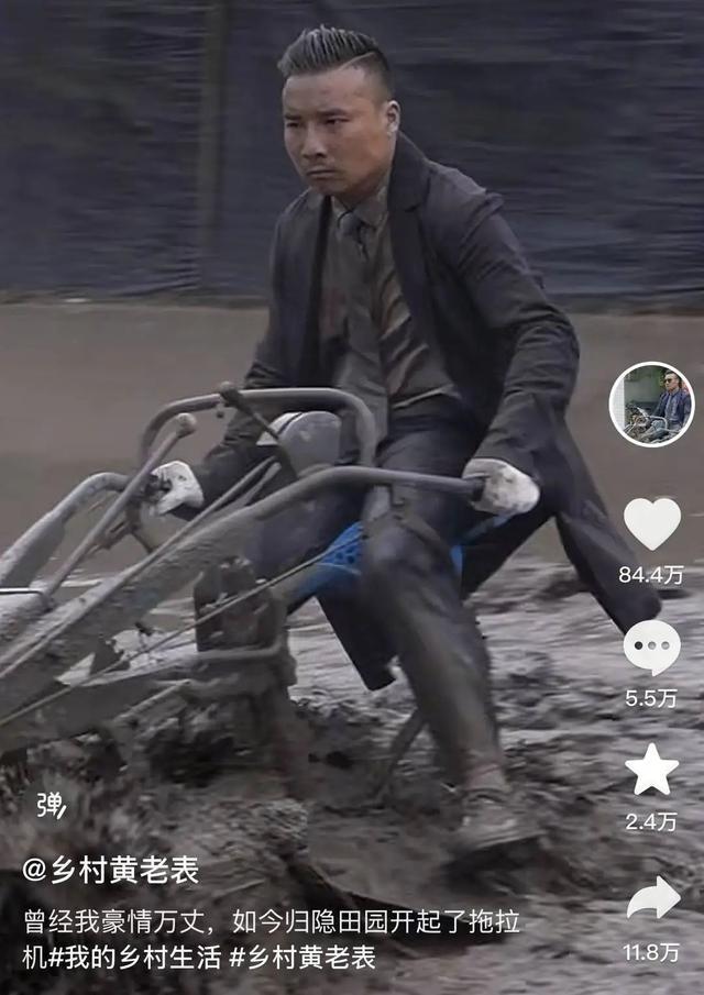 黄伟身着西装开着拖拉机犁田的短视频获赞80多万