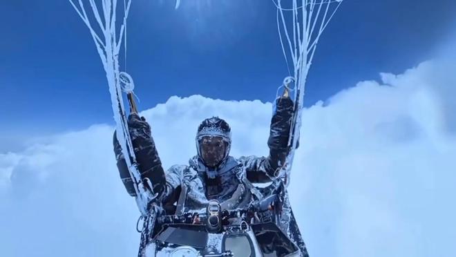 部分网传视频显示,事发时“六哥”没有氧气面罩,脸部直接裸露在空中,全身多处结冰、附满冰碴,但仍有意识地控制滑翔伞,最终安全降落。落地后其介绍称:“当时感觉到缺氧,手在外面一直冻着……然后一直在对讲。”