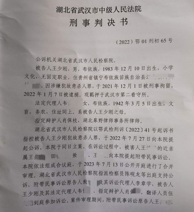 经司法鉴定,王某刚作案时处于偏执型精神分裂症发病期,被认定为限制刑事责任能力人。2023年8月7日,经武汉市中级人民法院审理,以故意杀人罪判处王某刚死刑,缓期两年执行。