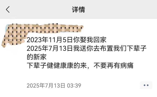 7月13日,鹿女士发布讣告,告别深爱的丈夫:“2023年11月5日你娶我回家,2025年7月13日我送你去布置我们下辈子的新家。下辈子健健康康的来,不要再有病痛。”