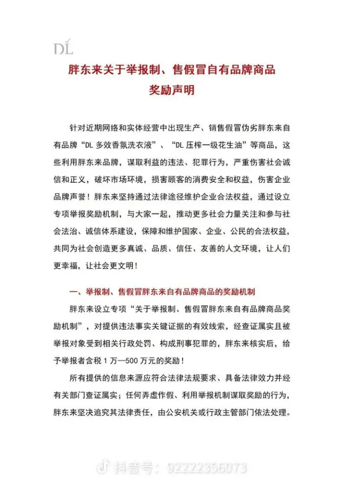 声明称,针对近期网络和实体经营中出现生产、销售假冒伪劣胖东来自有品牌“DL多效香氛洗衣液”“DL压榨一级花生油”等商品,这些利用胖东来品牌,谋取利益的违法、犯罪行为,严重伤害社会诚信和正义,破坏市场环境,损害顾客的消费安全和权益,伤害企业品牌声誉。