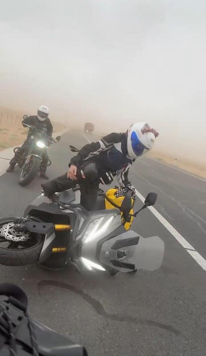 摩友李女士介绍,事发9月4日晚7时许,他们一行4人在从河北邯郸去新疆的摩旅途中,行至京新高速内蒙古额济纳旗某段,突然遇到超强横风,沙尘漫天,能见度瞬间降低,500多斤重的摩托车也被吹得摇摇晃晃。