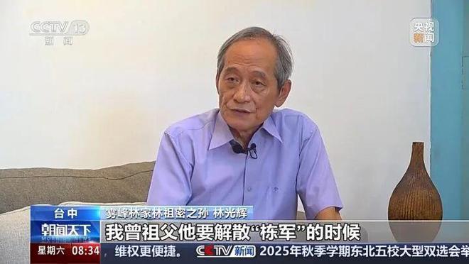 雾峰林家林祖密之孙林光辉:我曾祖父他要解散“栋军”的时候,最后下了一道军令,就是“归田不解甲枪炮带回家”,所以后来为什么整整20年武装抗日,台湾老百姓都有枪有炮,就是因为我们解散“栋军”的时候,枪炮带回家,但是我们子弹没办法供应,我们回到了大陆以后,我们第一件事情是从福州供应子弹回到台湾,因为我曾祖父认为他还想卷土重来。