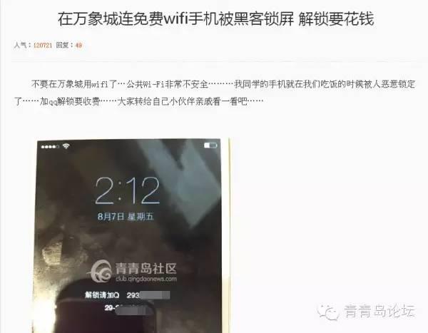 今年8月份,也有用户微博反映“在万象城连免费wifi手机被黑客锁屛,解锁要花钱”