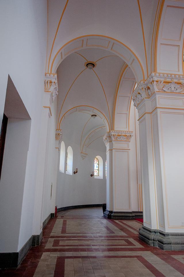大厅东西两侧设有走廊,后面设有两个大祭台,四个小祭台,厅的穹顶绘以圣象壁画,灯光炫目,充满浓厚的宗教气氛。屋顶覆盖舌头红瓦,其气势庞大,且又古朴典雅。