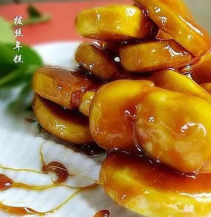 3、用铲子划圈,直至糖浆粘稠起泡,就把年糕倒入上浆,即后就可以装盘了。
