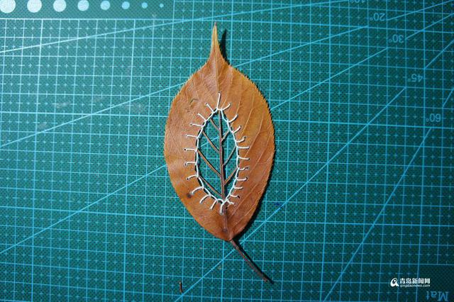 原来,绣画的主要材料包括树叶、刻刀、水粉颜料以及缝衣服的针线。其中,需要注意的是,树叶不能是新鲜的,在处理方式上,可将新鲜树叶放在书本中压上一段时间,需将一部分水分蒸发掉,树叶品种不限,法国梧桐的叶子较适宜。