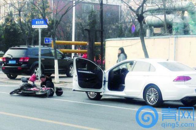 1月9日下午3时35分,张某驾驶大众轿车停靠在唐岛湾路东风路路口处,准备到附近的市场买点菜,停好车后其打开车门准备下车,突然,一辆电动自行车从后方驶来并撞到了车门上,骑车女子重重栽倒在地,致右眼眉和鼻子出血不止,轿车的车门也被撞得变了形。女司机张某吓坏了,站了一会儿才缓过神来,赶紧上前查看中年女子的伤情,随后报警并联系120急救中心。