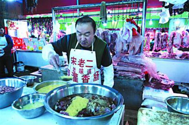 宋师傅从事猪肉销售和代灌香肠近三十年,在乐陵路小鲍岛市场知名度颇高,大家称呼他宋老二。宋老二对灌肠选肉有自己的理论,他说先选猪再选肉的部位。