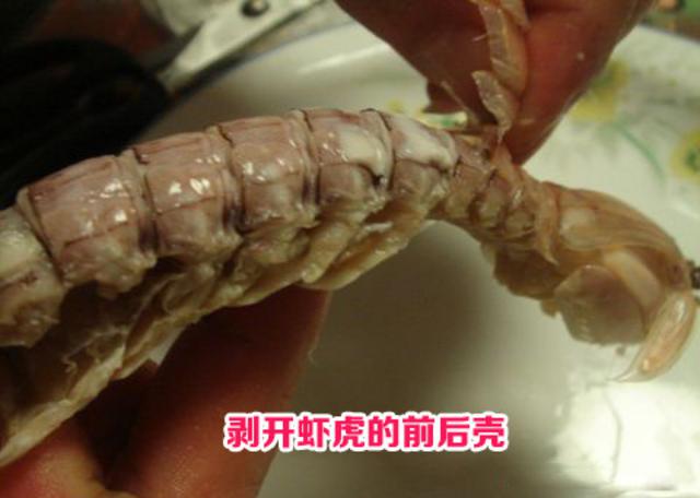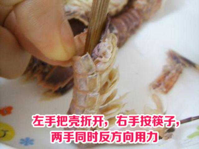 从头部开始往下数第四节开始把边上一侧的壳轻轻掀开,一手捏着头,另一手拿着壳一掀就搞定了。怎么现在才看到这个,这么多年,我是浪费了多少肉肉~!