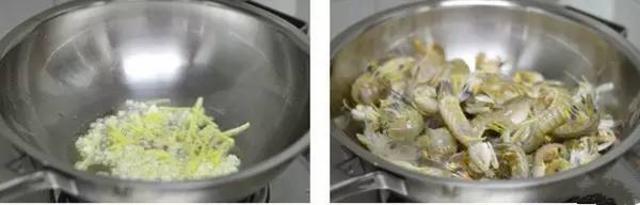3、接着爆香姜蒜,随后放虾虎拌炒。