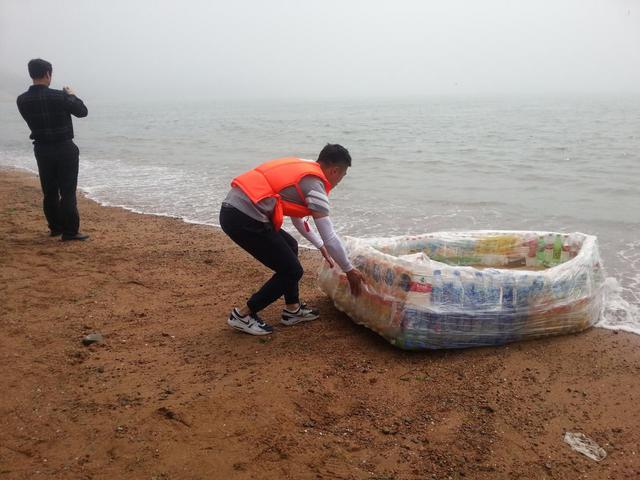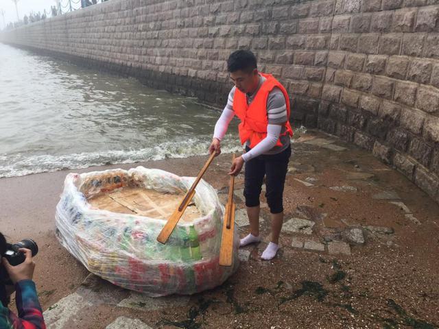 小编了解到,这位小伙叫刘佳祺,一直有一个航海梦,因受跑男节目勇渡长江的启发,决心完成这个梦想,用废旧瓶子自制一艘船,跨越胶州湾。刘佳祺介绍,自制的这艘船大约收集了500多个废旧瓶子,用胶带和保鲜膜固定船体。由于自学过航海专业知识,刘佳祺表示对此次航海非常有信心。