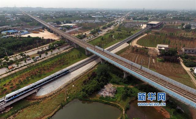 上线试运营的长沙磁浮快线从一条高铁轨道下驶过(5月6日摄)。新华社记者李尕摄