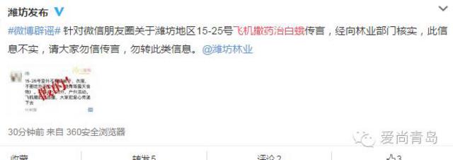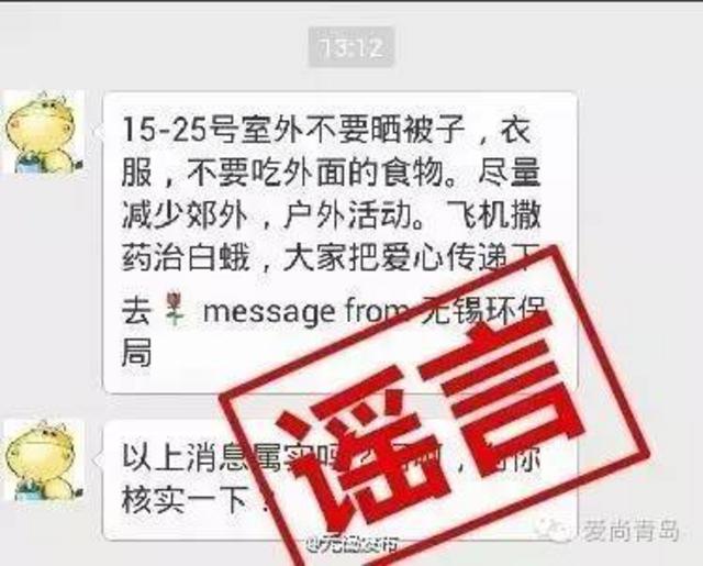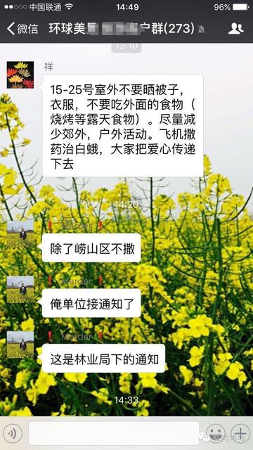 今天有条消息在朋友圈广泛传播:15-25号室外不要晒被子,衣服,不要吃外面的食物。尽量减少郊外,户外活动。飞机撒药治白蛾,大家把爱心传递下去!