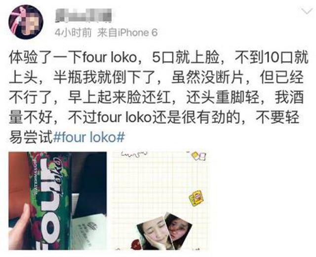 最近,微博上有一款酒精饮料Four Loko火起来了,最先爆料的网友@草莓馅儿虎称,“喝起来像果汁,但实际度数特别高,而且是后反劲的酒,圈内称失身酒”……据说酒量差的人喝一罐必断片。