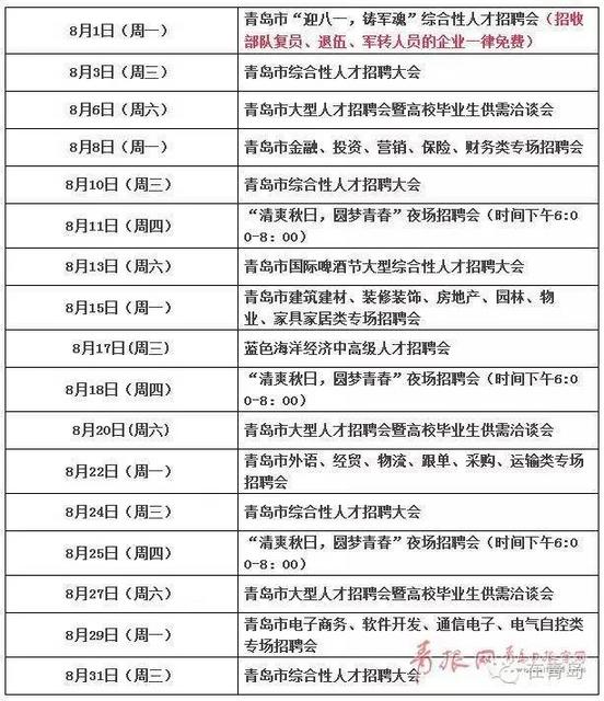 8月份共有17场大型招聘会在海尔路178号举行,其中包括综合性人才招聘大会,也有针对军转人员、高校毕业生、金融、建筑装修、海洋经济、电子通信等人群和专业的专类招聘大会。
