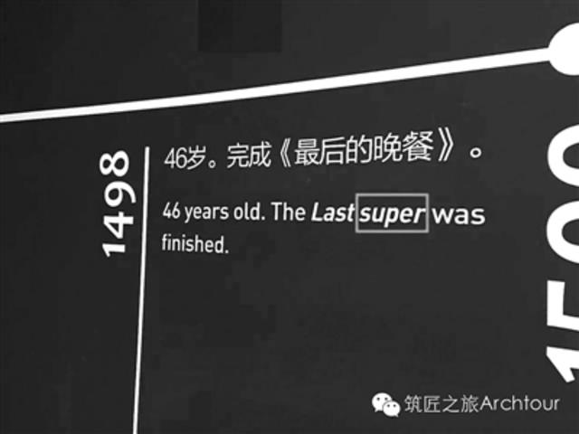 该网友发现,在这个介绍达·芬奇生平的年表上,英文错误不止一处:关于达·芬奇46岁的经历,展览介绍说:“46岁。完成《最后的晚餐》”,其对应的英文翻译是“46 years old. The Last super was finished.”而super一词在英文中的意思是“超级的”,“晚餐”的英文词汇实为supper,该翻译中少了一个字母“p”。