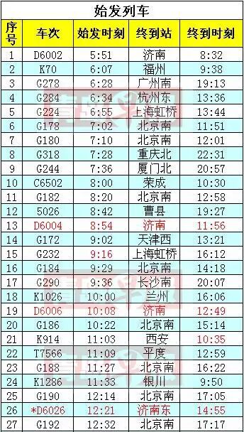 青岛~济南D6004/D6011次。D6004青岛开车时间改为8:54,终到由济南东站改为济南站11:56;D6011次到达青岛时间改为21:51,始发站由济南东站改为济南站,开车19:05。