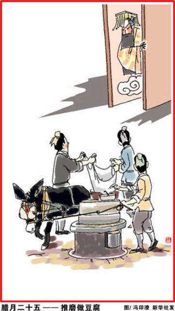腊月廿五,推磨做豆腐。传说玉帝会下界查访,吃豆腐渣以表清苦。