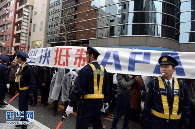2月5日,在日本东京新宿,在日华侨华人手举标语走过APA酒店。近百名在日华侨华人当日在东京举行了抗议APA酒店的和平游行活动。新华社记者马平摄