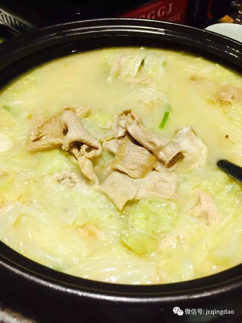 脂渣白菜炖杠子头。脂渣是青岛特色,杠子头选用的是莱西日瓣火烧,耐煮有咬头。精彩君强烈推荐,有肉、有面、有汤,两个人吃饭再加一道海鲜就够了。