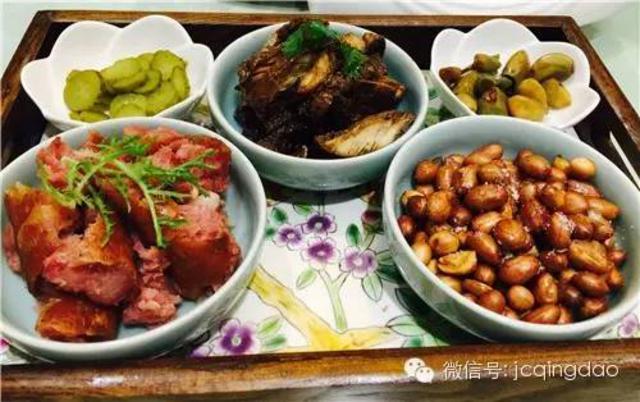 青岛味道:青岛大红肠、五香熏鱼、油炸花生米、腊八蒜、酱瓜。真正的下酒菜,够味儿。