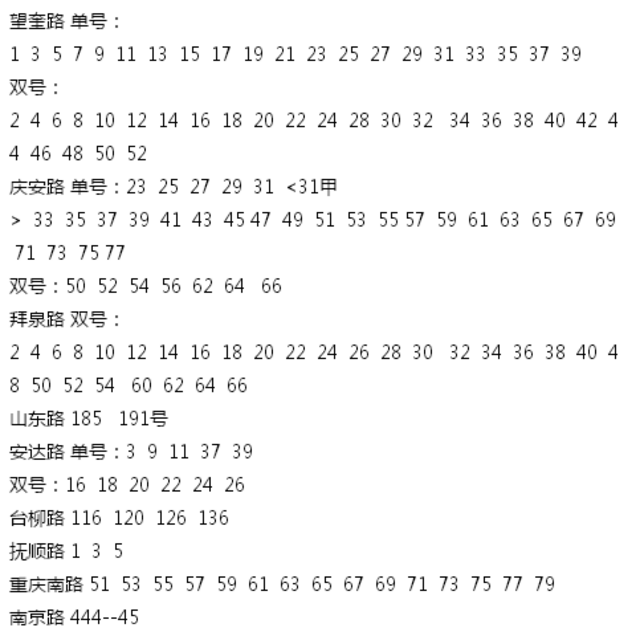 莱阳路:单号1--33号;延安一路:单号39—73、75号。