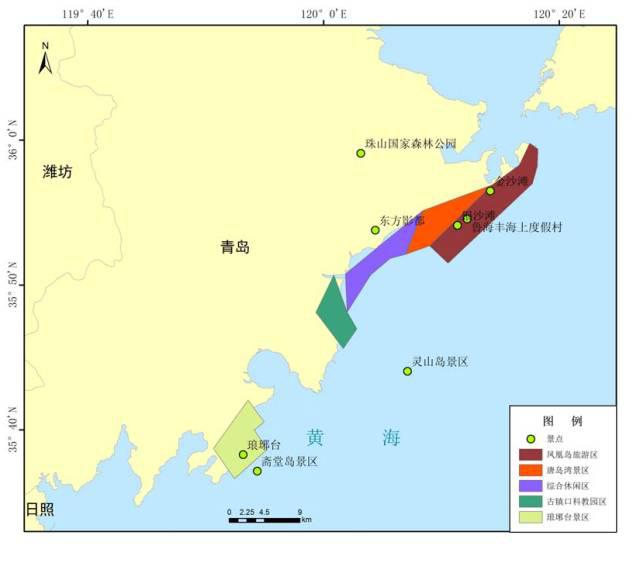 规划基于对海洋生态环境及资源的保护与恢复为目的,同时发展生态产业。根据海洋公园资源特点,规划凤凰岛旅游区、唐岛湾景区、综合休闲区、古镇口科教园区、琅琊台景区等五大片区。