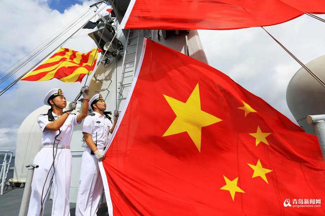 辽宁舰在维多利亚湾停泊后,信号兵将国旗升起。张凯 摄