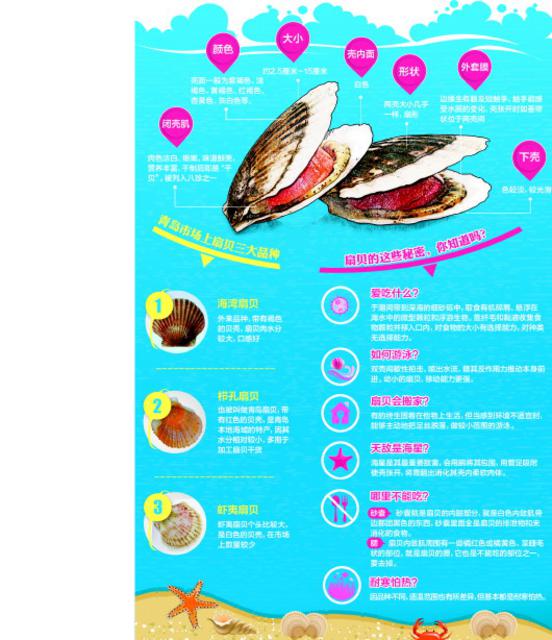 扇贝是“海八珍”之一,生活在岛城的市民,对扇贝肯定不陌生。说起扇贝,很多市民可能会想到多种扇贝的吃法:清蒸、蒜蓉、香烤、做汤……却不一定能分辨出岛城市场销售的主要品种。7月26日,记者从青岛海洋领域相关功能实验室及课题组采访了解到,岛城市场上主要有三种扇贝,外壳颜色分别为褐色、红色、白色,其中一种扇贝的亲贝基地位于灵山湾海域,因为只有这片海域能让种苗安全过冬。