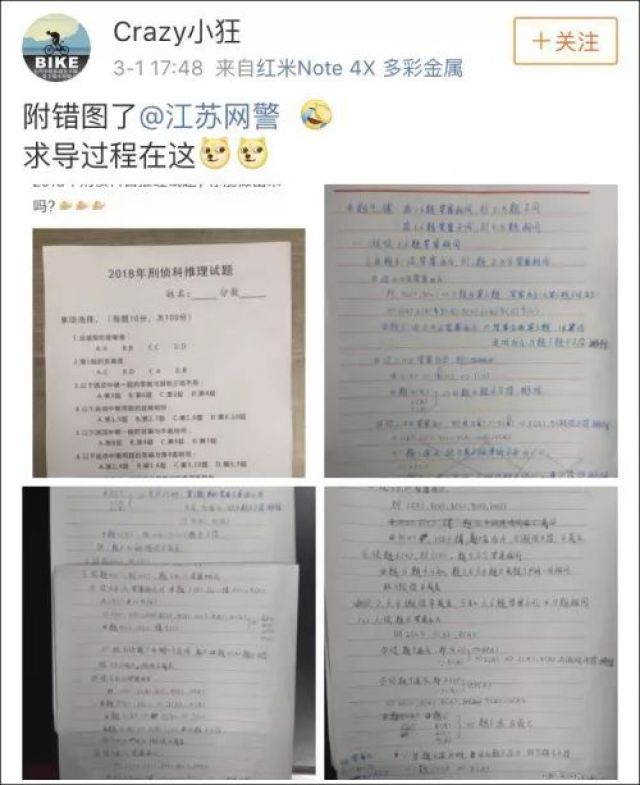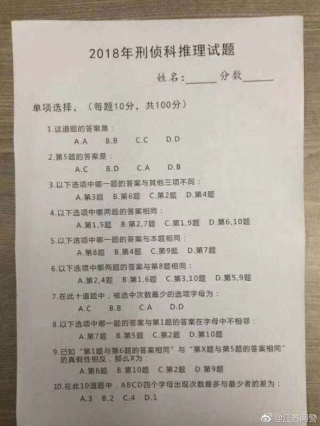 @江苏网警近日在微博上公布了一套2018年刑侦科目推理试题,从来没见过警察蜀黍考试题的我怀着好奇心点进去,不到10秒,求生欲就促使我退了出来……