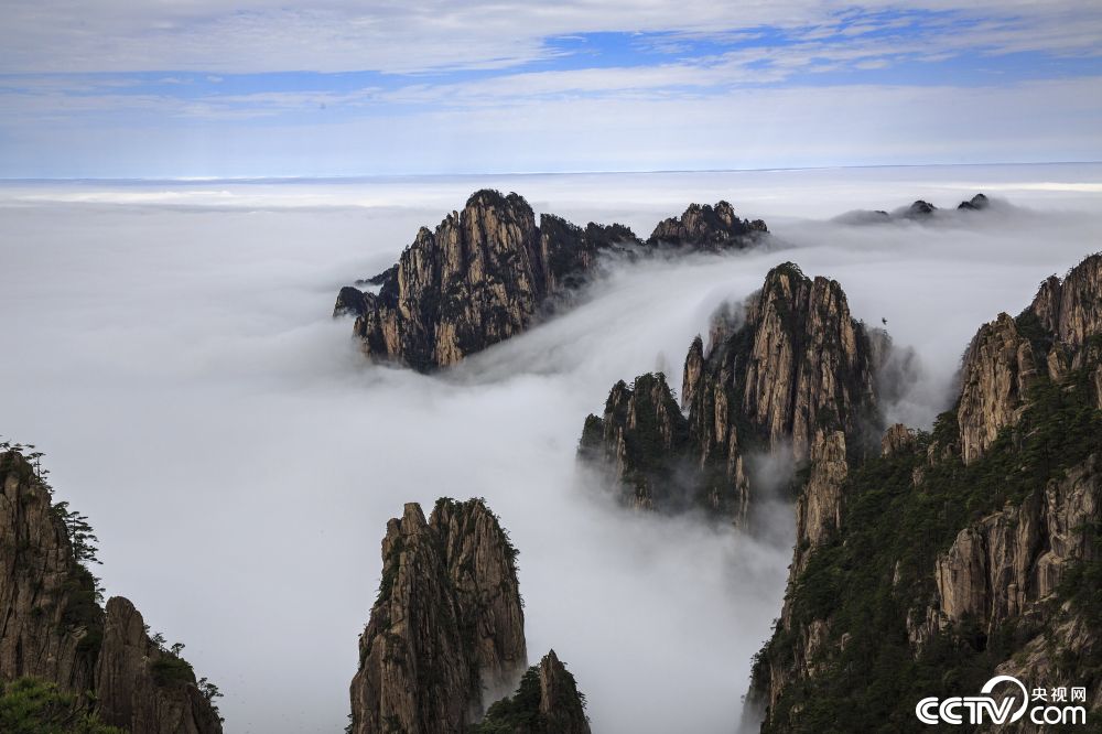 央视网消息:4月10日,安徽黄山风景区现壮丽的日出云海景观。黄山上空,云天万里,山峰与云海竞秀