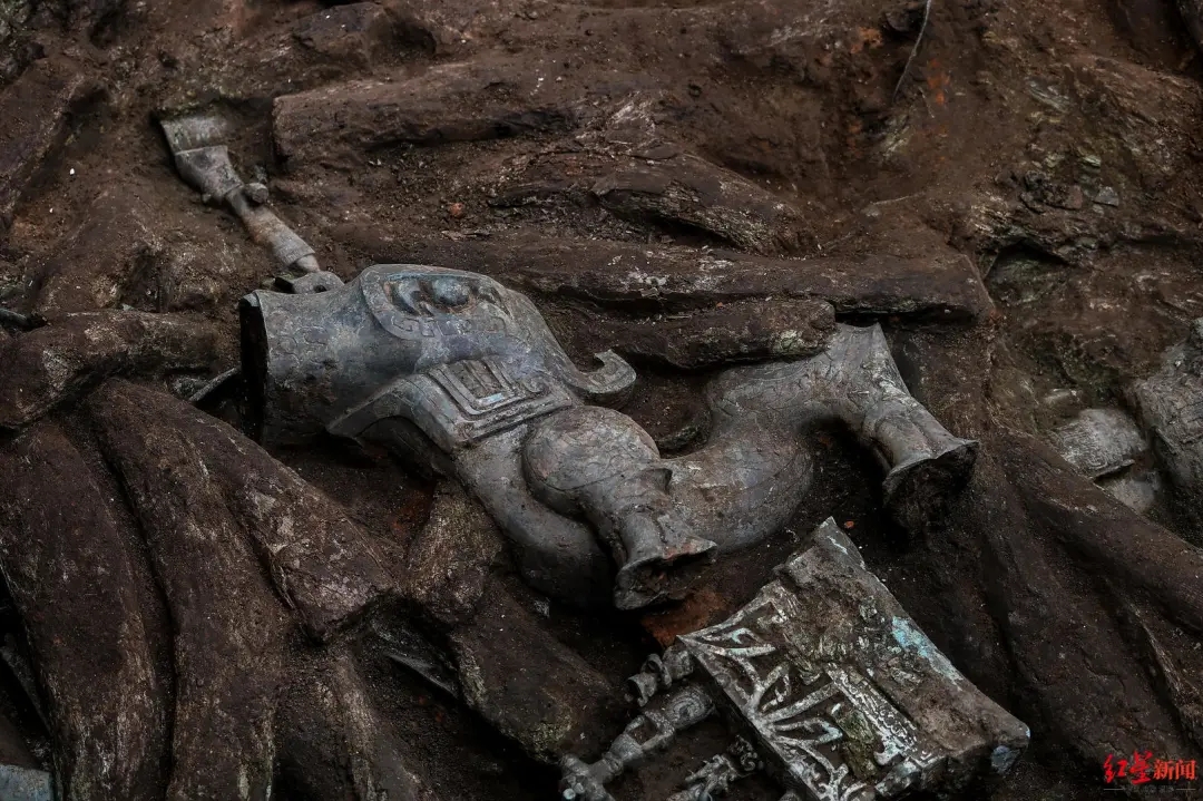 2021年3月,这件顶尊跪坐人像就在3号坑中露出了全貌,但考虑到这个坑的器物和象牙分布非常密集,必须按顺序进行提取,只能先取象牙,再取面具,最后提取铜顶尊,考古队为此花费了很长时间。