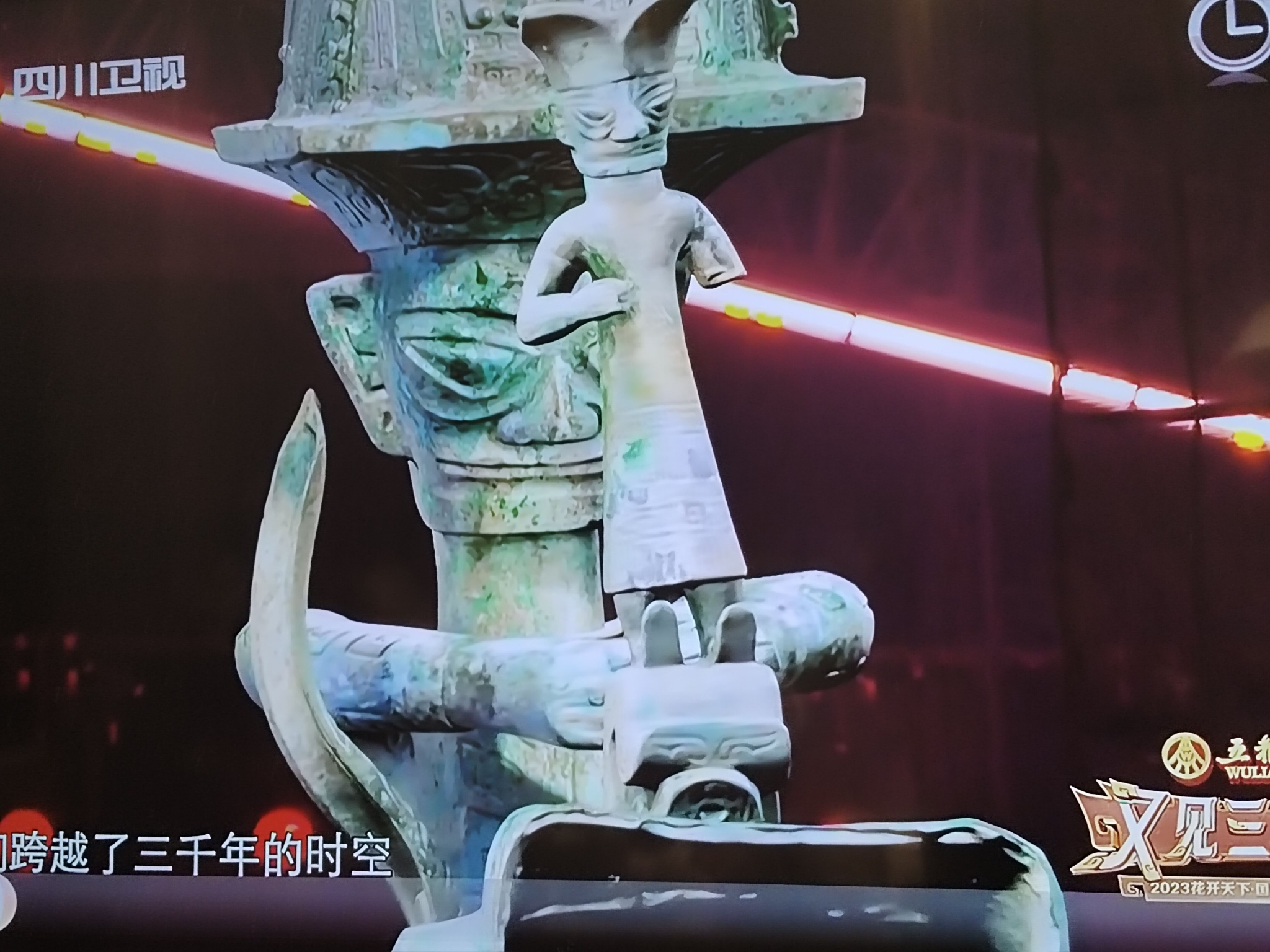 1月1日晚,四川卫视和三星堆合作的2023花开天下·国韵新年演唱会上,揭晓了一件观众未曾见过全貌的文物-3号坑出土的顶尊跪坐人像与8号坑的立人大神兽拼合在一起!拼合方式为顶尊人像“骑”在神兽背上。